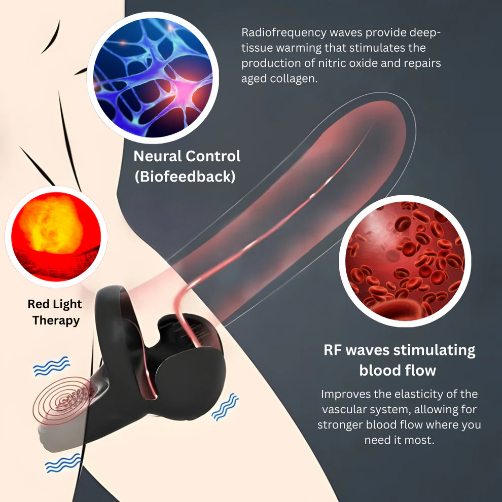 Phase 1: Vascular Rejuvenation (RF Therapy) Medical-grade Radiofrequency waves provide deep-tissue warming that stimulates the production of nitric oxide and repairs aged collagen. This improves the elasticity of the vascular system, allowing for stronger blood flow where you need it most.